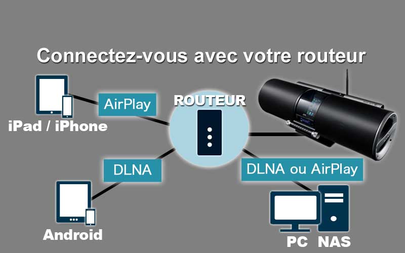 Le modèle RV-S5 est compatible avec les technologies sans fil AirPlay et DLNA. La connexion s'établit très facilement en quelques étapes. Il n'est même pas nécessaire de préparer un routeur. Vous pouvez ainsi profiter des plaisirs du sans fil dès le premier jour. Ou si vous avez un routeur, vous pouvez écouter tous les morceaux de musique stockés sur votre serveur (périphérique NAS par exemple). C'est un moyen puissant et chic d'écouter de la musique.